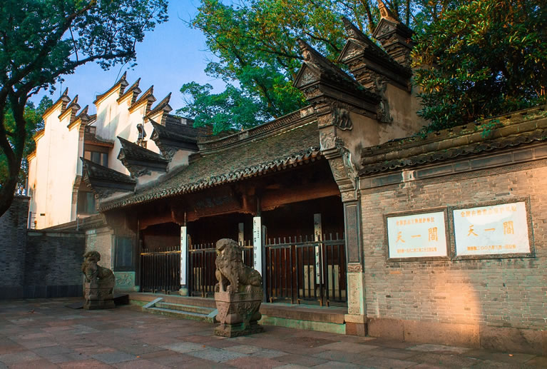 天一閣,位于浙江省寧波市海曙區(qū),建于明嘉靖四十年至四十五年(1561年—1566年),由當時退隱的明朝兵部右侍郎范欽主持建造,占地面積2.6萬平方米,已有400多年的歷史。天一閣藏書樓坐北朝南,為兩層磚木結(jié)構的硬山頂重樓式建筑,通高8.5米,斜坡屋頂,青瓦覆上。一層面闊、進深各六間,二層除樓梯間外為一大通間,以書櫥間隔。閣前鑿“天一池”通月湖,園林以“福、祿、壽”作總體造型,用山石堆成“九獅一象”等景點。天一閣及其周圍園林具有江南庭院式園林特色。天一閣的藏書和建筑為研究書法、地方史、石刻、石構建筑和浙東民居建筑提供了實物資料。