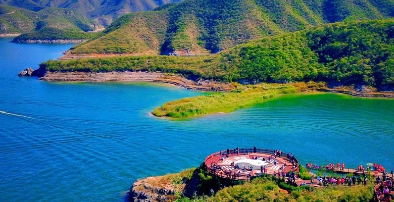 易水湖,原名安格莊水庫,位于河北省保定市易縣縣城西南25千米處,距北京150千米,距雄安新區(qū)80千米,易水湖南側(cè)與狼牙山相連,北側(cè)是紫荊關,西側(cè)是五峰寨,東側(cè)是九龍山,被稱為“北方小桂林”。易水湖是20世紀50年代利用四周高聳的山勢而修建的一座人工湖。易水湖水域面積約27平方千米,容量為3.9億立方米,最深處達48.5米。易水湖屬海河流域,大清河水系。易水湖依托山水自然資源和易文化,開發(fā)為度假區(qū),已建有易水文化休閑度假小鎮(zhèn)、養(yǎng)生島康養(yǎng)小鎮(zhèn)、老子峰3100米臨水棧道、高端度假湖景酒店、易水山谷、水上運動等業(yè)態(tài)項目。