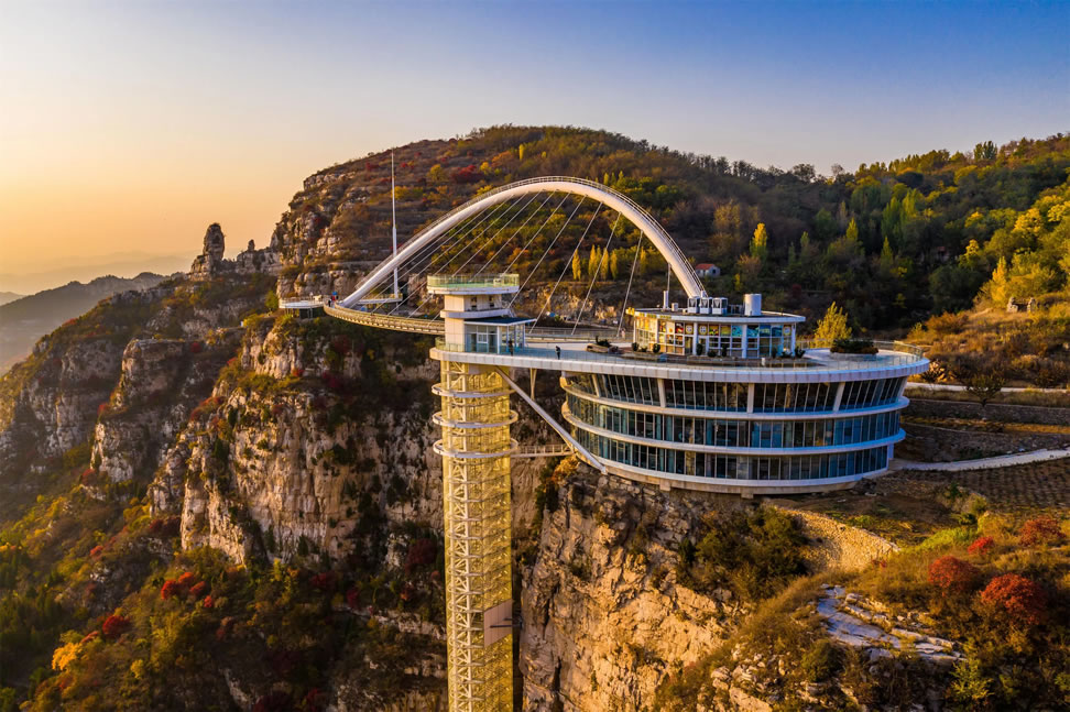 - 全長117米,懸空高度110米,為世界首例無背索斜拉弧形玻璃橋,橫跨峽谷之間,可俯瞰潭溪山全景,驚險(xiǎn)刺激。