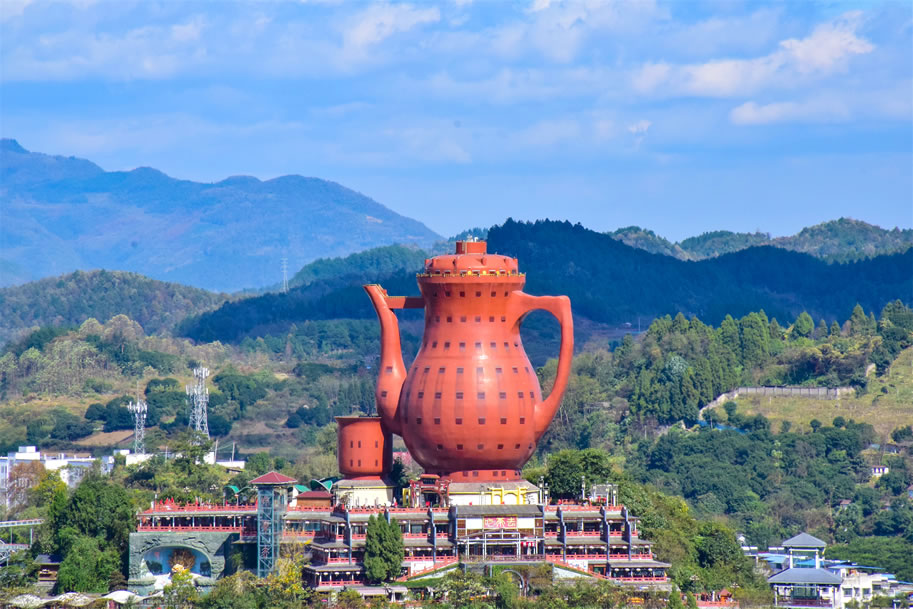 天下第一壺茶文化公園位于貴州省遵義市湄潭縣火焰山山頂。其核心景觀'天下第一壺'壺身高48.2米(含基座總高73.8米),獲上海大世界基尼斯總部認證的"最大茶壺實物造型"稱號。公園占地面積6萬余平方米,包含茶文化博物館、中華茶道館、水上樂園等五大功能區(qū),壺頂設有射程達20公里的激光燈形成獨特夜景。該公園作為貴州十大魅力景區(qū),形成了'一樓一壺一瓶一林'的遵義旅游新格局。