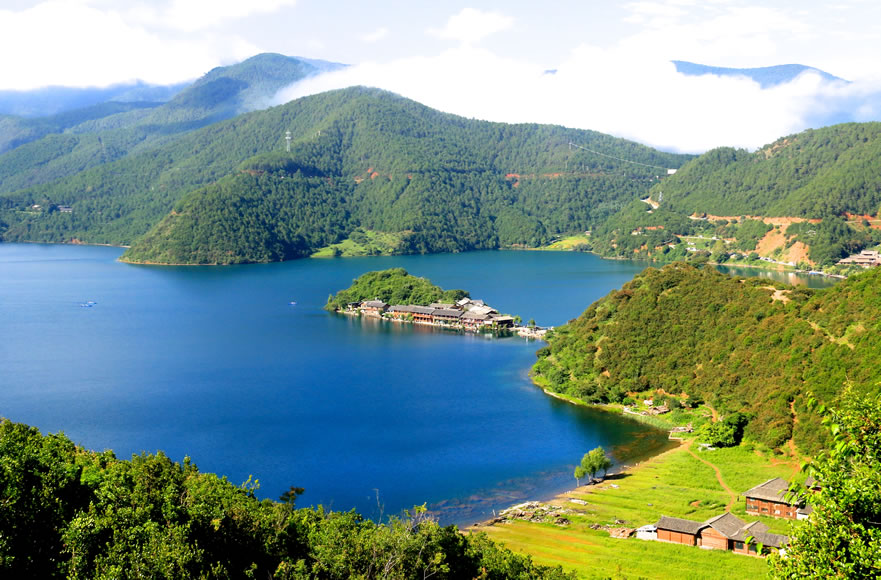 麗江瀘沽湖摩梭文化旅游區(qū),地處麗江市寧蒗縣永寧鄉(xiāng)與四川省鹽源縣左所鄉(xiāng)交界處,是摩梭族人的主要聚居地,素有“高原明珠”之稱(chēng),是云南省九大高原湖泊之一。行政區(qū)劃上,瀘沽湖隸屬四川省鹽源縣和云南省寧蒗縣共同管轄,其中四川省鹽源縣管轄東部的29.6平方千米(含沼澤濕地5.8平方千米),云南省寧蒗縣管轄西部的27.0平方千米。瀘沽湖,在地貌區(qū)劃上屬橫斷山系切割山地峽谷區(qū),橫斷山北段高山峽谷亞區(qū)和滇東盆地山原區(qū),滇西北中山山源亞區(qū)交界地帶。瀘沽湖湖岸多彎曲,形成深淵的小港灣,湖中有大小島嶼七個(gè),都是石灰?guī)r殘丘。沿湖東部湖底有長(zhǎng)形深槽,北部和長(zhǎng)島兩側(cè)的湖坡陡峻。湖北面有獅子山,東北面有肖家火山,西南為狗鉆洞山地。