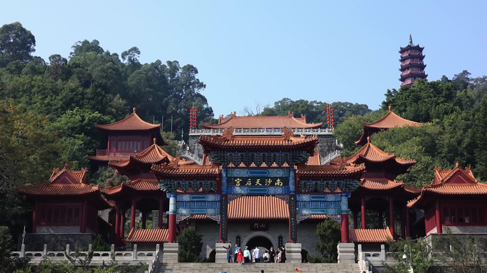 廣州南沙天后宮,又叫“媽祖廟”,位于廣東省廣州市南沙區(qū)天后路88號,坐落于大角山東南麓,地處粵港澳大灣區(qū)之心,瀕臨珠江出?诘牧尕暄,占地面積達18萬平方米。廣州南沙天后宮前身是明代建于鹿頸村的天妃古廟,清乾隆年間經(jīng)重修定名為元君古廟,抗戰(zhàn)時期被日寇飛機炸毀,而后于1994年重建。廣州南沙天后宮是為紀念海上女神林默而建,是一個以媽祖文化為主題的景區(qū),是粵港澳大灣區(qū)媽祖文化交流中心,亦是東南亞最大之媽祖廟。廣州南沙天后宮采用清式建筑對稱布局,高低錯落地依山而建,建筑的特點集北京故宮的風格和南京中山陵的氣勢于一體,規(guī)模為現(xiàn)今世界同類建筑之最。廣州南沙天后宮由廣場、宮殿和南嶺塔三部分構(gòu)成,“天后八景”包括:濱海銀灘朝陽、五彩靈徑、媽祖靈釵、“南沙人”遺址、靈宮賜福、南嶺夕照、抗戰(zhàn)神炮、默娘之家八個景點。