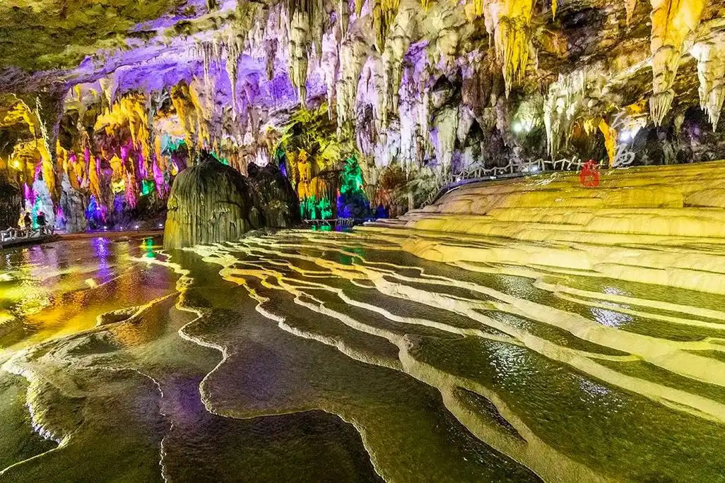 - 核心特色:洞內(nèi)分四層結(jié)構(gòu),已開放第二層約2公里游覽線,包含五大主題廳——吉星迎賓、壯鄉(xiāng)聽海、云山鑒水、詩畫田園、幽靜奇觀。景觀涵蓋鈣華池梯田、神象賜福、天下第一鐘等1000余處天然獨(dú)立景觀,其中鈣華池群面積達(dá)6000平方米,黑白對(duì)比形成獨(dú)特視覺奇觀。