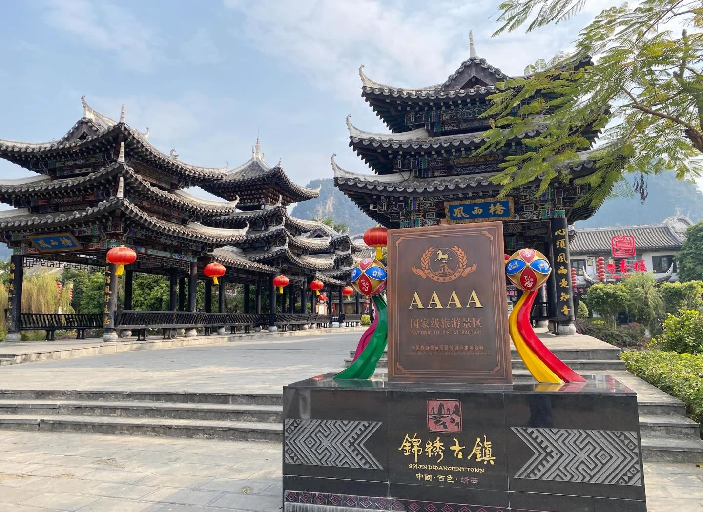 錦繡古鎮(zhèn),位于廣西壯族自治區(qū)百色市靖西市。古鎮(zhèn)一期工程于2018年12月26日正式開街,依托靖西山水資源和壯族文化,以復(fù)興城市文脈為主線,打造壯族文化傳承載體和旅游集散中心。項目涵蓋文化體驗、休閑娛樂、餐飲住宿等功能,建筑融入燈籠、銅鼓等壯族元素,具有濃厚民俗特色。古鎮(zhèn)建筑融合壯族民俗元素,如雕梁畫棟、銅鼓、繡球等,分為文旅商業(yè)街區(qū)、小吃燒烤區(qū)、主題客棧區(qū)等。以壯族文化、邊境文化、生態(tài)養(yǎng)生為主題,提供“吃住行游購娛”全方位體驗。古鎮(zhèn)建成后素有“小桂林”之稱,描繪出小橋流水的壯鄉(xiāng)畫卷。