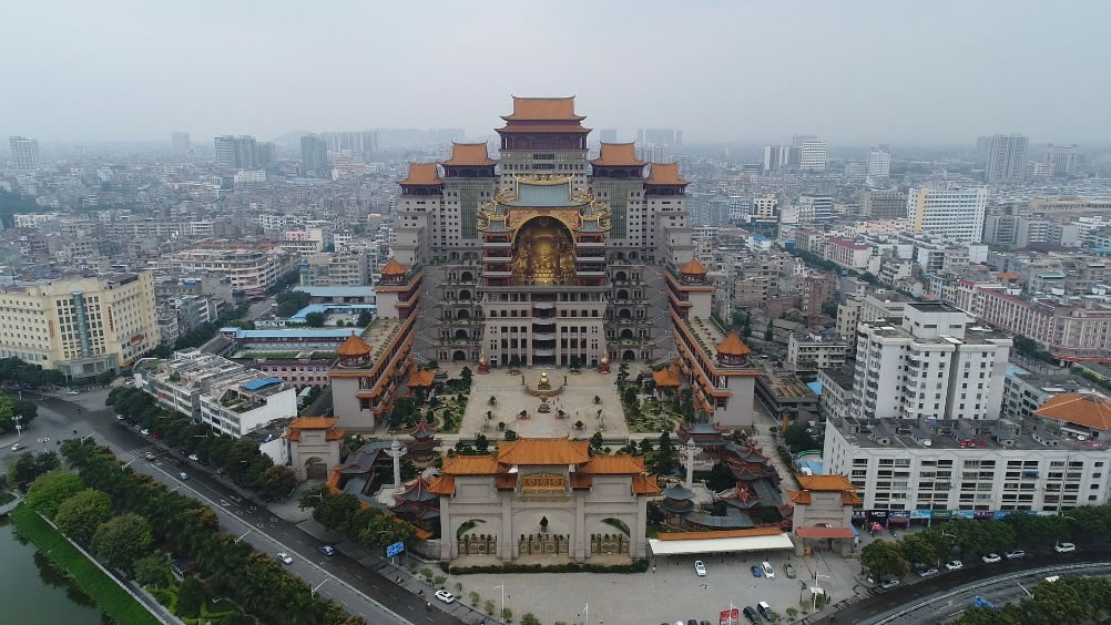 - 地理位置:廣西玉林市玉州區(qū)江濱路461號(hào),國家AAAA級(jí)景區(qū),占地70畝,建筑面積14萬平方米,主樓21層高108米,被譽(yù)為“玉林版布達(dá)拉宮”,集雕塑藝術(shù)、民俗文化、珍寶展示于一體。