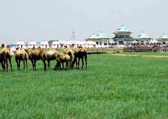 旅游區(qū)占地6000畝,總建筑面積為3260平方米,整體設(shè)計突出民族特色;五個殿堂式迎賓包,坐落在1.3米高的平臺上,氣勢磅礴,造型典雅,富麗堂皇,兩側(cè)是18個豪華型固定包和14個傳統(tǒng)氈包,組成蒙古包群。建筑的正南面是周長為1000米的賽馬場,通遼市一年一度的賽馬節(jié)就在這里舉行。