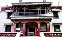 喇彌仁殿(菩提道學(xué)經(jīng)堂),又稱(chēng)日木倫殿。建于光緒十八年(1892年),位于護(hù)法殿后邊西北高聳的山坡上,為教義戒律學(xué)部,這個(gè)學(xué)部在內(nèi)蒙地區(qū)藏傳佛教寺院中只有五當(dāng)召設(shè)立。是召?gòu)R建筑群中建造年代最晚的建筑物。殿內(nèi)正中供奉銅鑄高九米的黃教創(chuàng)始人宗喀巴坐像。左右兩側(cè)塑其兩大弟子嘉曹杰和克珠杰塑像。兩側(cè)木龕內(nèi)有一千尊一模而成的宗喀巴塑像。二樓凸起的天窗既可容納高大的塑像,又可采納光線,顯示了獨(dú)具匠心的藏傳佛教寺廟建筑特點(diǎn)。