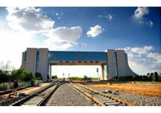 國門莊嚴(yán)肅穆,在國門乳白色的門體上方嵌著“中華人民共和國”七個鮮紅大字,上面懸掛的國徽閃著的金光,國際鐵路在下面通過。
