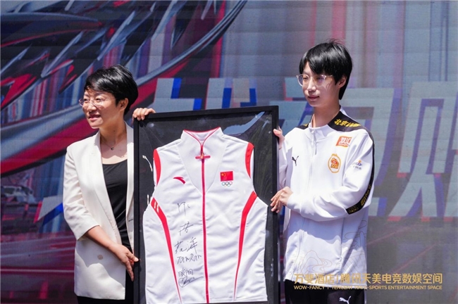 開業(yè)現(xiàn)場(chǎng)還舉辦了隆重的授牌儀式。由杭州第19屆亞運(yùn)會(huì)電子競(jìng)技王者榮耀亞運(yùn)版本冠軍選手林恒,上臺(tái)將由6位亞運(yùn)冠軍簽名的戰(zhàn)袍贈(zèng)予了萬斐酒店騰訊天美電競(jìng)數(shù)娛空間項(xiàng)目。