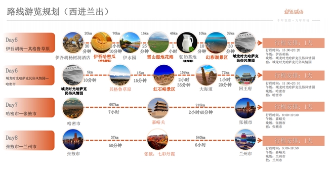 沿途景點涵蓋了蘭州、張掖七彩丹霞、嘉峪關(guān)關(guān)城、敦煌莫高窟、敦煌鳴沙山月牙泉景區(qū)、星星峽、伊吾胡楊景區(qū)、伊吾哈密瓜(淖毛湖鎮(zhèn))、伊水園、伊吾雪山濕地花海、伊吾駝奶基地(鹽池鎮(zhèn))、伊吾幻彩湖景區(qū)、伊吾齊格魯草原、伊吾紅石峪景區(qū)、哈密大海道、回王府、大柴旦翡翠湖、茶卡鹽湖、青海湖、西寧。