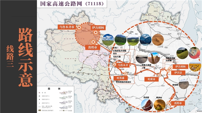 沿途景點為烏魯木齊、吐魯番火焰山、昌吉州天山山池、昌吉州江布拉克大草原、奇臺、木壘、善庫木塔格沙漠景區(qū)、了墩、哈密大海道、伊吾齊格魯草原、伊吾幻彩湖景區(qū)、伊吾胡楊景區(qū)、星星峽、敦煌莫高窟、敦煌鳴沙山月牙泉景區(qū)、敦煌市。