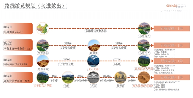 線路三“千里西域行”則以“千年敦煌·萬年胡楊”——烏魯木齊至敦煌絲路星辰探索之旅為主題,該線路亮點為敦煌莫高窟、鳴沙山、伊吾胡楊、北疆自然風(fēng)景觀光和民族文化體驗等。全程路線大約2202.6公里