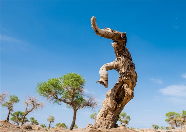 九千年胡楊,這里胡楊樹形也同樣奇特,有的胡楊猶如一頭大象,象鼻朝下吸水,象背馱著元寶自遠(yuǎn)處而來,為游客帶來吉祥和財富;有的胡楊春萌新芽,夏葉婆娑,秋金滿地,冬蘊傲骨;有的胡楊就像古代的帝王莊嚴(yán)的祭祀著天地的生靈,祈求一方祥和,護(hù)佑一方安寧。