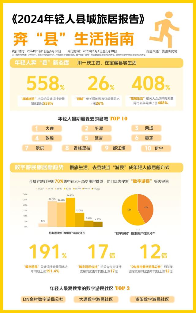 美團(tuán)近期發(fā)布的《2024年輕人縣城旅居報告》(下稱《報告》)顯示,今年暑期,大理、平潭、榮成、敦煌、延吉為年輕人最愛去的縣城。這些年輕人熱衷搜索“數(shù)字游民”“旅居”等關(guān)鍵詞,“數(shù)字游民公社”大眾點(diǎn)評搜索量同比去年同期上漲17倍。