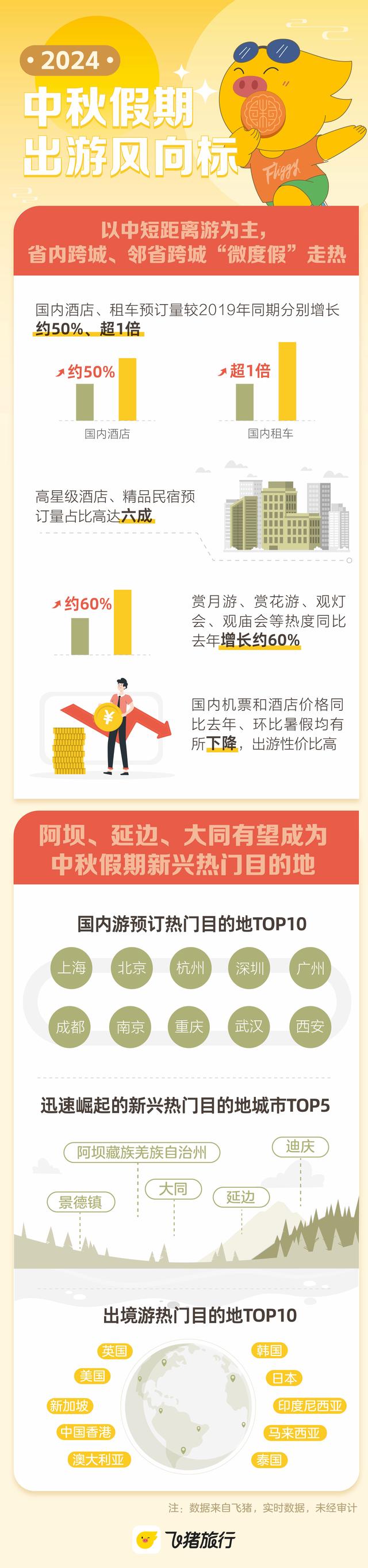 飛豬數(shù)據(jù)顯示,截至目前中秋假期國內(nèi)酒店預(yù)訂量較2019年同期增長約50%,其中高星級(jí)酒店、精品民宿預(yù)訂量占比高達(dá)六成。江浙滬、廣深珠、京津、川渝都市圈內(nèi)的特色酒店、民宿和度假村,該特征更為明顯。