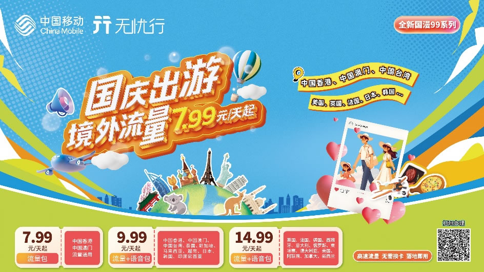 這個國慶,想要來一場說走就走的出境游,記得到中國移動APP【首頁-國漫專區(qū)】頁面或無憂行APP【流量-境外流量】頁面,選購國漫99系列產(chǎn)品, 出境前記得開通【中國移動國際/港澳臺漫游功能】,就可以輕松解決境外通訊問題啦!讓中國移動帶給你高速穩(wěn)定的網(wǎng)絡(luò)體驗和服務(wù)。