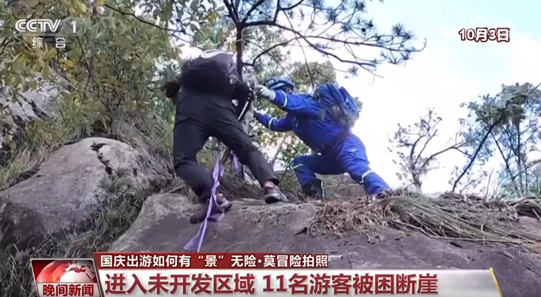 10月2日傍晚,有11名外地游客在安徽績溪縣一座未開發(fā)的山上攀爬時,因?yàn)槊月穼?dǎo)致被困,當(dāng)?shù)毓埠兔耖g救援隊立即展開聯(lián)合救援。在3日凌晨一點(diǎn)多,救援人員找到了被困游客,由于游客被困的地方是未開發(fā)的區(qū)域,山勢十分陡峭,且有多處斷崖,救援人員只能反復(fù)利用繩索,將被困游客挨個兒送至安全地帶。