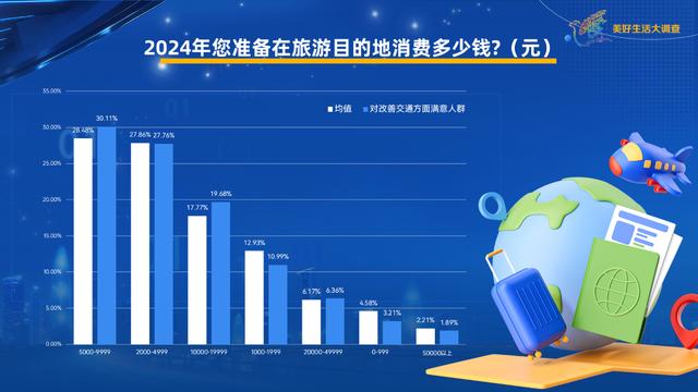 《美好生活大調(diào)查》發(fā)現(xiàn),對交通方面滿意人群,預(yù)計(jì)旅游消費(fèi)在5000至9999元和10000至19999元的占比都高出均值2個百分點(diǎn)。