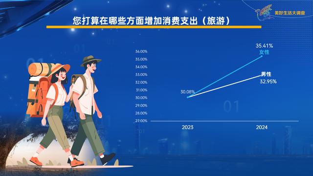 旅游大軍中,女性的出游意愿高漲。準(zhǔn)備今年在旅游方面增加消費(fèi)的女性占比較去年增加了5個百分點(diǎn),也比男性高出2個百分點(diǎn)以上,是2024年旅游消費(fèi)妥妥的“主力軍”。