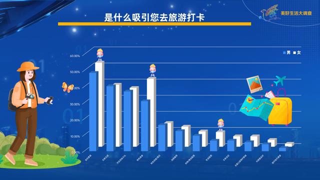 《美好生活大調(diào)查》發(fā)現(xiàn),自然景觀是吸引大家去旅游打卡的最主要因素,有將近一半的人會因此選擇旅游目的地。名勝古跡、歷史民俗文化和特色美食緊隨其后。不同人群中,女性對城市的特色美食超級偏愛,因?yàn)樘厣朗橙ヒ粋城市旅游的女性占比高出男性11個百分點(diǎn)以上。跟女性相比,男性對名勝古跡和特色民宿/酒店更感興趣一點(diǎn)。