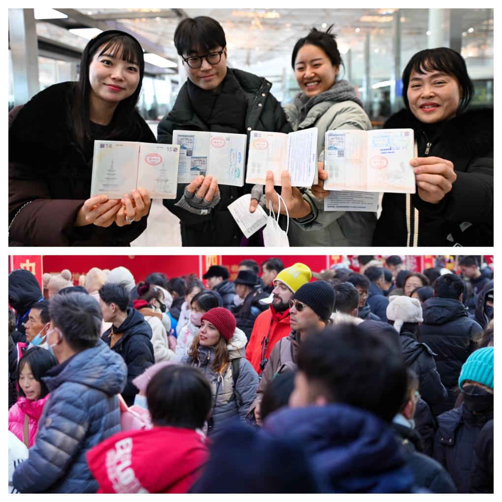 拼圖:(上圖)1月28日,在首都國(guó)際機(jī)場(chǎng),四名韓國(guó)游客利用免簽政策來(lái)中國(guó)旅游,他們向記者展示著護(hù)照上的入境章。(下圖)1月29日,兩位來(lái)自西班牙的游客在北京地壇廟會(huì)游覽。