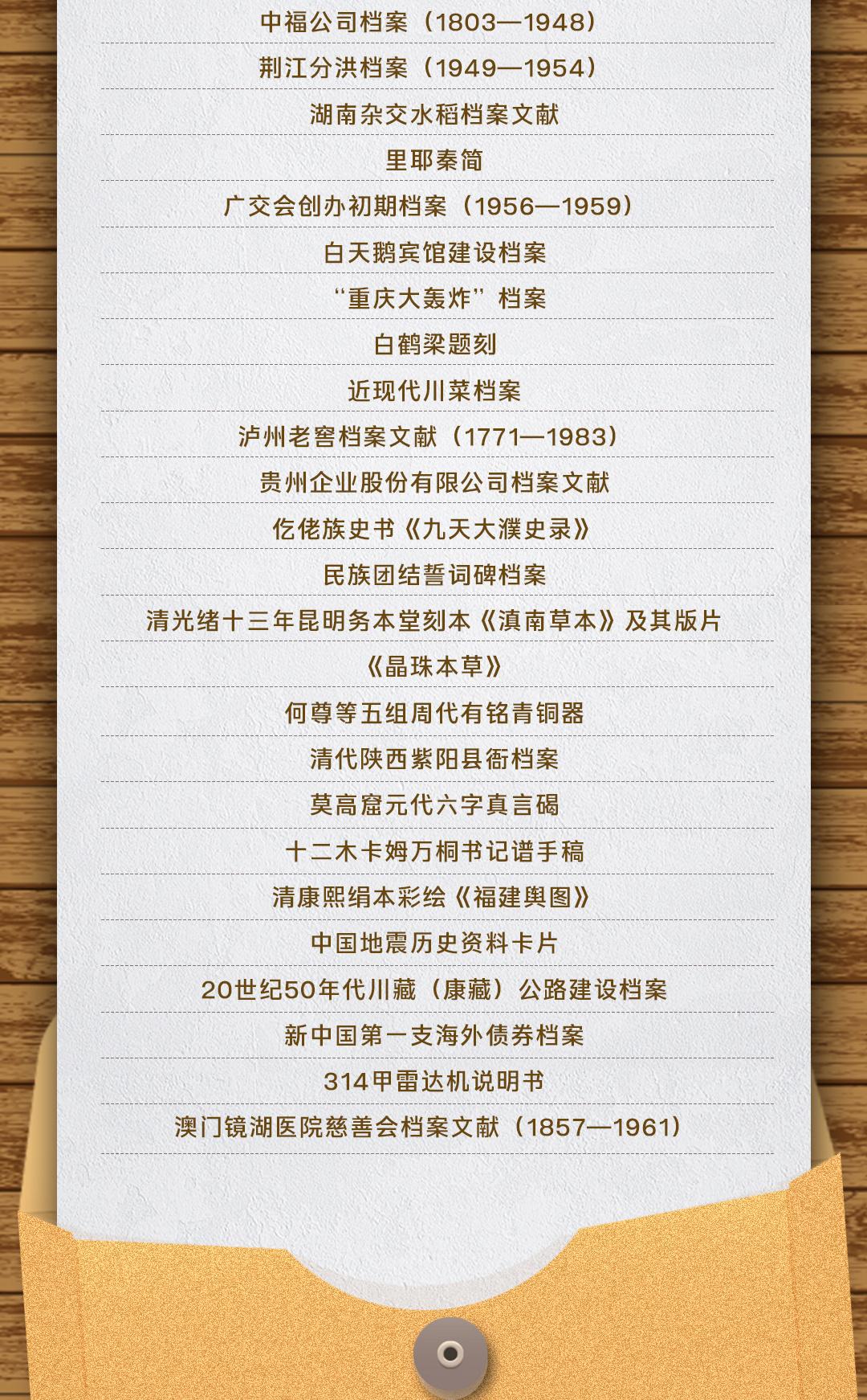 截至目前,我國(guó)有250項(xiàng)檔案文獻(xiàn)入選《中國(guó)檔案文獻(xiàn)遺產(chǎn)名錄》。“中國(guó)檔案文獻(xiàn)遺產(chǎn)工程”自2000年啟動(dòng),重點(diǎn)開(kāi)展檔案文獻(xiàn)遺產(chǎn)的搶救、保護(hù)和開(kāi)發(fā),其中的《甲骨文》《清代科舉金榜》《隨州曾侯乙編鐘》等十多個(gè)項(xiàng)目已被列入聯(lián)合國(guó)教科文組織《世界記憶國(guó)際名錄》。