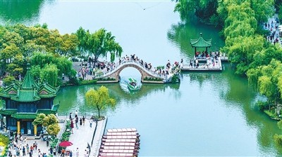 隨著“蘇超”破圈,江蘇揚州借勢發(fā)力,推出“看球+賞景”文旅套餐,圖為游客在瘦西湖風景區(qū)賞景游玩。