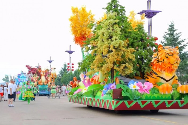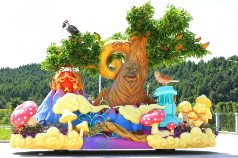 花車設計不僅注重視覺沖擊力,更融入動態(tài)特效:虎頭擺動、翅膀扇動、雪花機噴灑等細節(jié),讓靜態(tài)的造型煥發(fā)生命力。夜幕降臨時,花車更以夜光效果點亮林海,為觀眾呈現(xiàn)一場光影交織的奇幻盛宴。