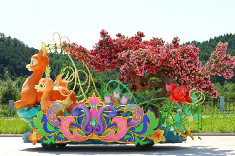 “鹿逐花夢花車”,巧妙融合了小興安嶺獨特的自然景觀與生物多樣性。車頭三只靈動的小鹿象征著伊春“中國鹿鄉(xiāng)”的美譽,與九峰山、金山鹿苑等標志性景觀交相輝映。盛開的杜鵑、百合和冰凌花點綴其間,展現(xiàn)伊春四季分明的生態(tài)特色;ㄜ囃ㄟ^森林古樹與野生動物的和諧共生場景,生動詮釋了伊春“生態(tài)立市”的發(fā)展理念,既彰顯了“中國林都”豐富的自然資源,又傳遞出人與自然和諧共處的生態(tài)文明思想,讓觀眾在夢幻的森林之旅中感受生態(tài)保護的深遠意義。