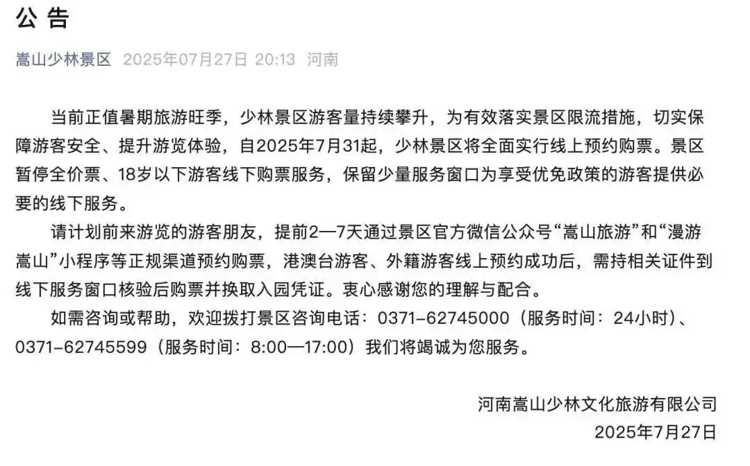 7月27日,嵩山少林景區(qū)官方公眾號(hào)發(fā)布最新消息顯示:當(dāng)前正值暑期旅游旺季,少林景區(qū)游客量持續(xù)攀升,為有效落實(shí)景區(qū)限流措施,切實(shí)保障游客安全、提升游覽體驗(yàn),自2025年7月31日起,少林景區(qū)將全面實(shí)行線(xiàn)上預(yù)約購(gòu)票。景區(qū)暫停全價(jià)票、18歲以下游客線(xiàn)下購(gòu)票服務(wù),保留少量服務(wù)窗口為享受優(yōu)免政策的游客提供必要的線(xiàn)下服務(wù)。