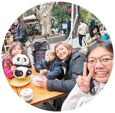 馮燕(右)與外國游客在鶴鳴茶社合影。 受訪者供圖