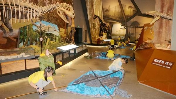 為應(yīng)對(duì)夜場(chǎng)活動(dòng)數(shù)量多、而館內(nèi)工作人員有限的情況,博物館引入專業(yè)研學(xué)團(tuán)隊(duì)負(fù)責(zé)夜宿活動(dòng)的策劃與執(zhí)行。30組親子家庭在破冰活動(dòng)后,跟隨專業(yè)講解員走進(jìn)展廳,深入了解脊椎動(dòng)物的演化歷程;體驗(yàn)4D電影和化石盲盒等手工制作;最后,在博物館鎮(zhèn)館之寶——長(zhǎng)達(dá)26米的馬門(mén)溪龍骨架化石下搭起帳篷,伴著生動(dòng)的睡前故事進(jìn)入夢(mèng)鄉(xiāng)。