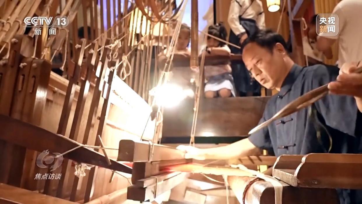 蜀錦省級非遺傳承人 曹代武:梭子從這個開口里邊過來,然后我就把緯線編織到里面了,織出來就是你現(xiàn)在看到的這個唐代的五彩鳥紋樣。再來一梭,一梭一梭的,就這樣反反復復。