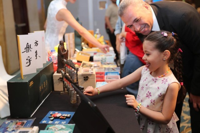 6月12日,一名女孩在埃及開羅舉辦的“茶和天下”尼羅雅集活動現(xiàn)場體驗“遇見孔子”非遺文創(chuàng)產(chǎn)品。新華社記者 隋先凱 攝