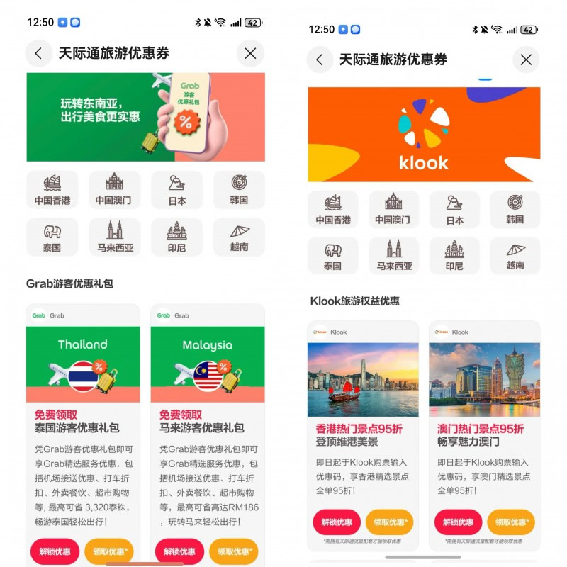 天際通「十月暢行月」第四重禮·領(lǐng)權(quán)益,天際通聯(lián)合全球合作伙伴,為用戶提供超值旅游權(quán)益包,覆蓋Grab打車、Klook景點(diǎn)門票、酒店餐飲等場(chǎng)景,在馬來(lái)西亞、泰國(guó)、歐洲等地均可享受出境專屬折扣。