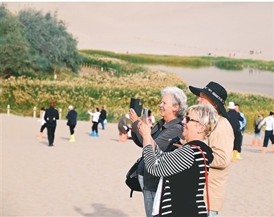 外國(guó)游客在甘肅省鳴沙山月牙泉景區(qū)游覽拍照。