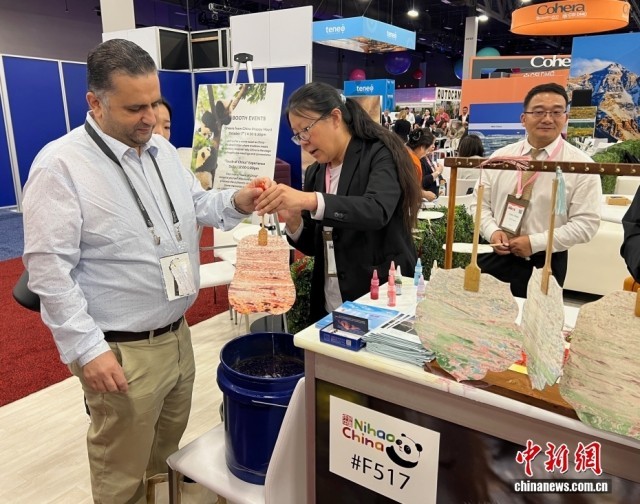 當地時間10月8日,2025年美國會議獎勵旅游展(IMEX America)繼續(xù)在拉斯維加斯舉行。這是全球會議及獎勵旅游領域最具影響力的展會之一。中國展臺舉辦“中華一刻”——中國非物質文化遺產體驗等豐富多彩的活動,吸引眾多與會者感受中華文化魅力。圖為與會者在中國展臺體驗漆扇制作。