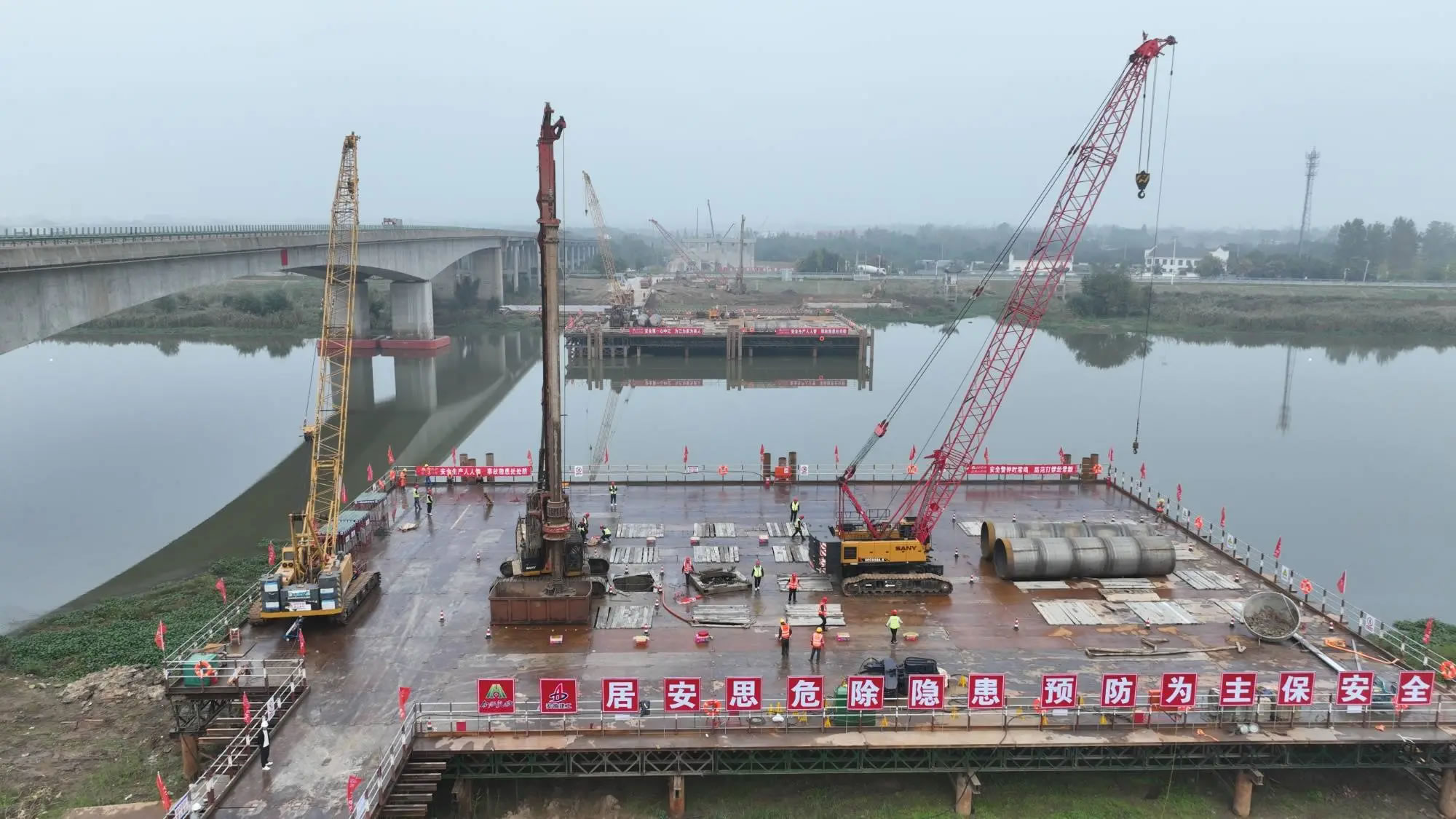 作為項(xiàng)目的重點(diǎn)控制性工程,杭埠河特大橋跨越寬闊的杭埠河航道及兩岸堤防,橋面全寬達(dá)37.5米,主橋設(shè)計(jì)為(85+150+85)米矮塔斜拉橋,引橋部分跨越杭埠河?xùn)|岸大堤則采用了(34+67+34)米連續(xù)梁橋。主墩下部采用群樁基礎(chǔ),48根直徑達(dá)2.0米的鉆孔灌注樁深嵌河道,施工環(huán)境特殊、技術(shù)復(fù)雜、施工組織難度較大。樁基施工采用了效率高、成孔質(zhì)量好的旋挖鉆工藝。為確保施工安全、質(zhì)量及減少對杭埠河河道的影響,項(xiàng)目團(tuán)隊(duì)周密策劃,優(yōu)化調(diào)整鋼板樁支護(hù)以及深基坑專項(xiàng)施工方案,組織專家進(jìn)行嚴(yán)格論證,確保方案科學(xué)可靠。同時(shí),在樁基施工前,對地質(zhì)情況進(jìn)行鉆探并報(bào)勘察單位進(jìn)行復(fù)核,做到心中有數(shù),精準(zhǔn)施工。