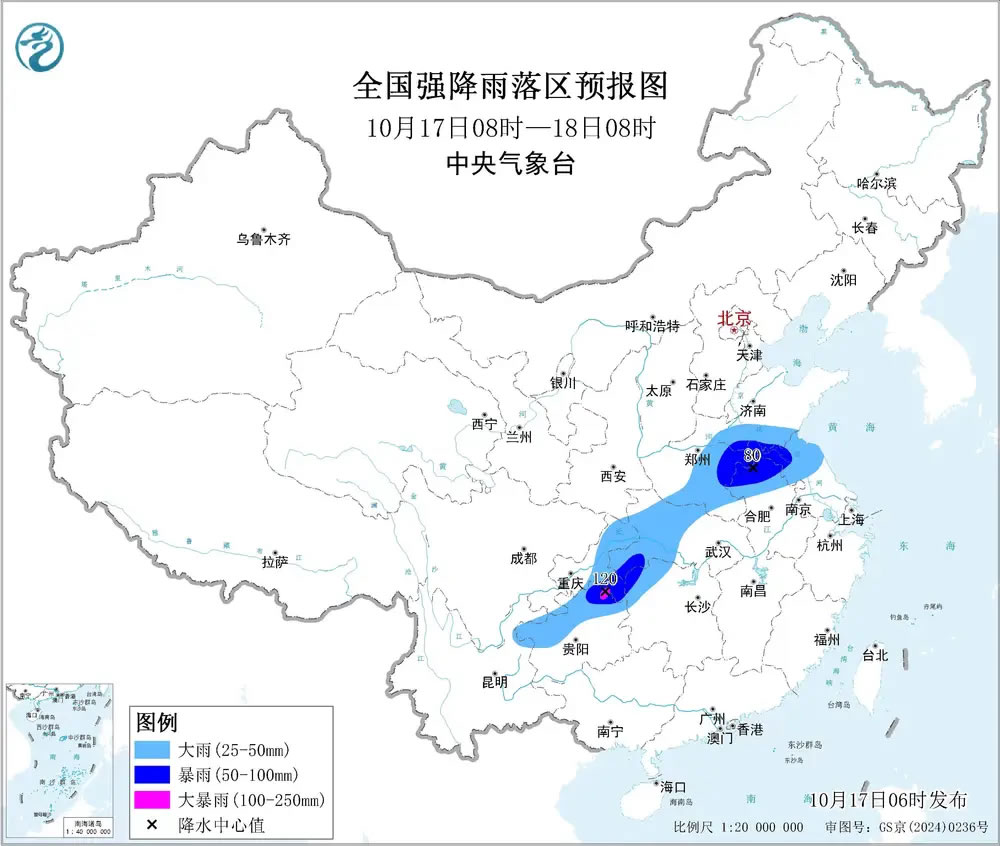 預(yù)計,10月17日8時至18日8時,重慶東部和北部、湖北中西部、河南中東部、山東南部、安徽北部、江蘇北部、湖南西北部、貴州西部和北部等地部分地區(qū)有大到暴雨,其中,重慶東南部、貴州東北部等地局地有大暴雨(100~120毫米)。上述部分地區(qū)伴有短時強(qiáng)降水(最大小時降雨量20~40毫米,局地可超過50毫米),局地有雷暴大風(fēng)等強(qiáng)對流天氣。