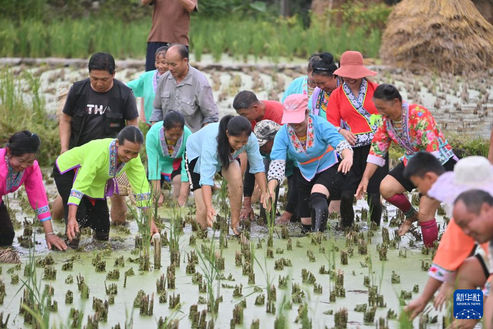 10月18日,在柳州市融水苗族自治縣安太鄉(xiāng)培秀村,村民們在稻田里進(jìn)行抓魚比賽(無人機(jī)照片)。