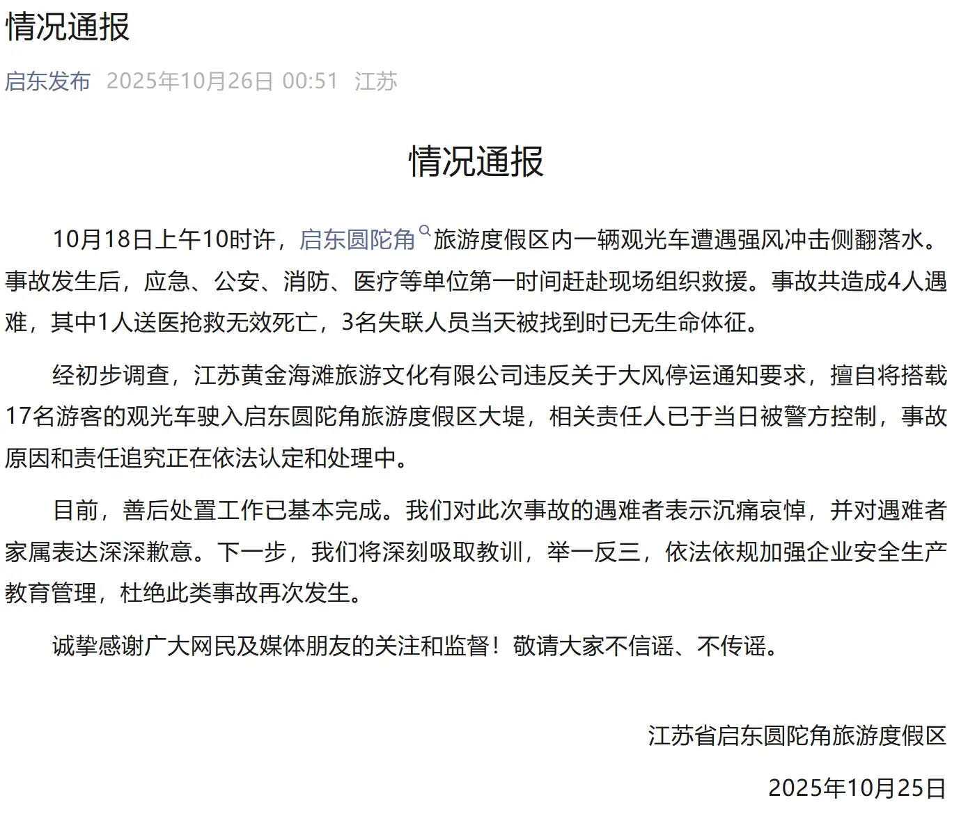 該通報(bào)稱,10月18日上午10時(shí)許,啟東圓陀角旅游度假區(qū)內(nèi)一輛觀光車遭遇強(qiáng)風(fēng)沖擊側(cè)翻落水。事故發(fā)生后,應(yīng)急、公安、消防、醫(yī)療等單位第一時(shí)間趕赴現(xiàn)場組織救援。事故共造成4人遇難,其中1人送醫(yī)搶救無效死亡,3名失聯(lián)人員當(dāng)天被找到時(shí)已無生命體征。