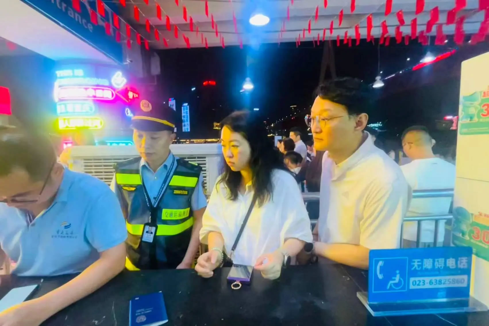 10月5日晚,兩名韓國游客因手機損壞無法出示購票信息,向洪崖洞客運碼頭兩江游執(zhí)法服務(wù)站求助。執(zhí)法人員一邊安撫游客,一邊協(xié)調(diào)技術(shù)人員通過后臺系統(tǒng)查詢,不到5分鐘便幫助游客順利登船。這一高效處置展現(xiàn)了服務(wù)站“事企聯(lián)動”機制的優(yōu)勢,也為外國游客留下了美好的重慶印象。