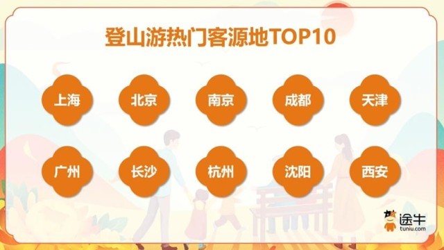 《報告》數(shù)據(jù)顯示,二線及以上城市用戶是登山游的主力軍,在今年途牛登山游用戶中的出游人次占比超過了70%。其中,上海、北京、南京、成都、天津、廣州、長沙、杭州、沈陽、西安等是排名靠前的客源地城市。