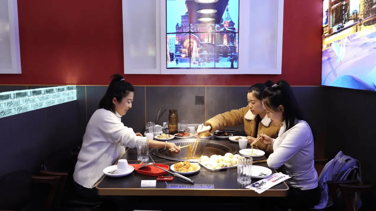 走進(jìn)同江市一家人氣很旺的鐵鍋燉餐館,濃郁的肉香混雜著酸菜的清爽撲面而來(lái),鐵鍋里的大鵝與酸菜咕嘟作響,店內(nèi)十余張餐桌座無(wú)虛席,食客們的談笑聲與鐵鍋的燉煮聲交織成冬日里熱鬧的煙火氣。這是同江商家搶抓冰雪季商機(jī)推出特色優(yōu)惠套餐帶來(lái)的人氣。