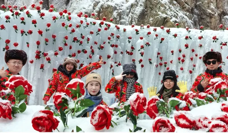 冰封的玫瑰、融入巖畫元素的雪雕、百米長的雪圈滑道,將景區(qū)打造成夢幻的冰雪秘境。身著多彩冬裝的游客們穿梭其間,或駐足觀賞或拍照打卡,不時發(fā)出陣陣贊嘆。“巖畫和冰雪結合,就像穿越到了冰河時代!”來自西安的游客李女士,一邊拍攝冰封玫瑰,一邊向同伴分享自己的感受。