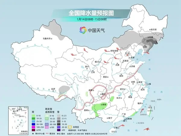 明天,內(nèi)蒙古中部、黑龍江南部、吉林、遼寧中東部、新疆北部、西藏東北部、河北北部等地部分地區(qū)有小雪或雨夾雪,其中,吉林中南部、遼寧北部和東部等地部分地區(qū)有中到大雪,吉林東部局地有暴雪。湖南西部、貴州中南部、云南東部、廣東東南部沿海、臺(tái)灣島東部等地部分地區(qū)有小雨。