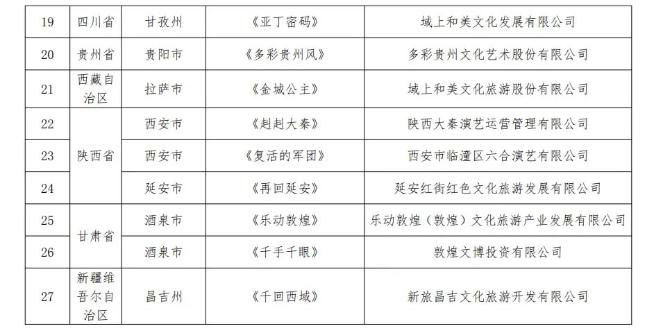 央廣網(wǎng)北京1月16日消息(記者 宋雪)文化和旅游部辦公廳近日發(fā)布通知,公布第二批全國旅游演藝精品名錄入選項(xiàng)目名單,《只有紅樓夢·戲劇幻城》《赳赳大秦》《樂動(dòng)敦煌》等27個(gè)項(xiàng)目入選。