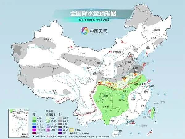 今天,雨雪將繼續(xù)向南大幅擴張;明天起,此輪雨雪進入鼎盛時段。未來四天,中東部地區(qū)自北向南將先后出現(xiàn)大范圍雨雪天氣過程,秦嶺-淮河以南地區(qū)降水相態(tài)復雜,有雨雪及凍雨的轉(zhuǎn)換。西北地區(qū)東部、華北中南部、黃淮、江漢、江淮西部、江南北部等地有中到大雪或雨夾雪,其中,陜西南部、河南中南部、湖北西部、湖南北部、安徽西部等地部分地區(qū)有暴雪,河南中南部、湖北西部、湖南、貴州、重慶東北部等地部分地區(qū)有凍雨,西南地區(qū)東部、江南南部、華南西部等地有小雨。