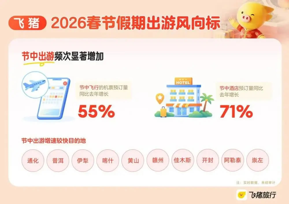 美團旅行數據顯示,2026年春運期間,“反向過年”的車票預訂量增長明顯。2月初至2月中下旬,“反向過年”的機票預訂量同比增長84%。春節(jié)假期的火車票雖未開售,預約單量也增長過半。從機票的預訂情況看,“反向過年”Top10熱門目的地為北京、上海、成都、重慶、廣州、深圳、昆明、西安、杭州、天津。