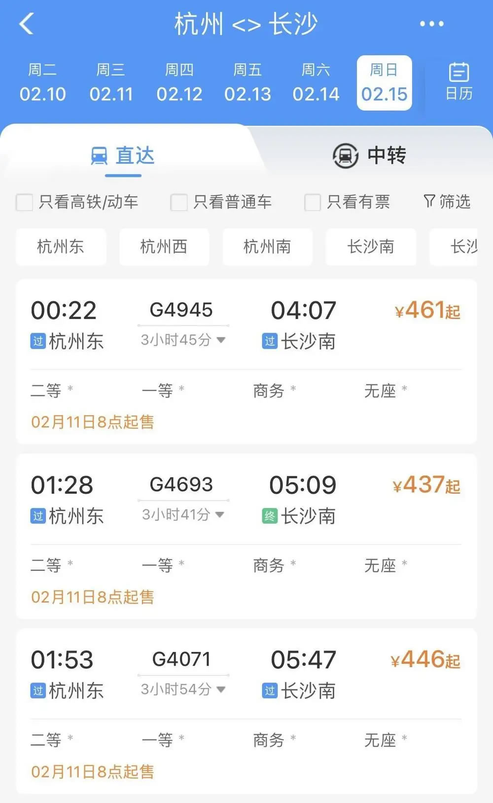 記者注意到,杭州前往武漢、長(zhǎng)沙、貴陽(yáng)等方向,在2月15日凌晨就將加開(kāi)多趟夜間高鐵列車(chē),這些車(chē)次并不在原有運(yùn)行圖中。